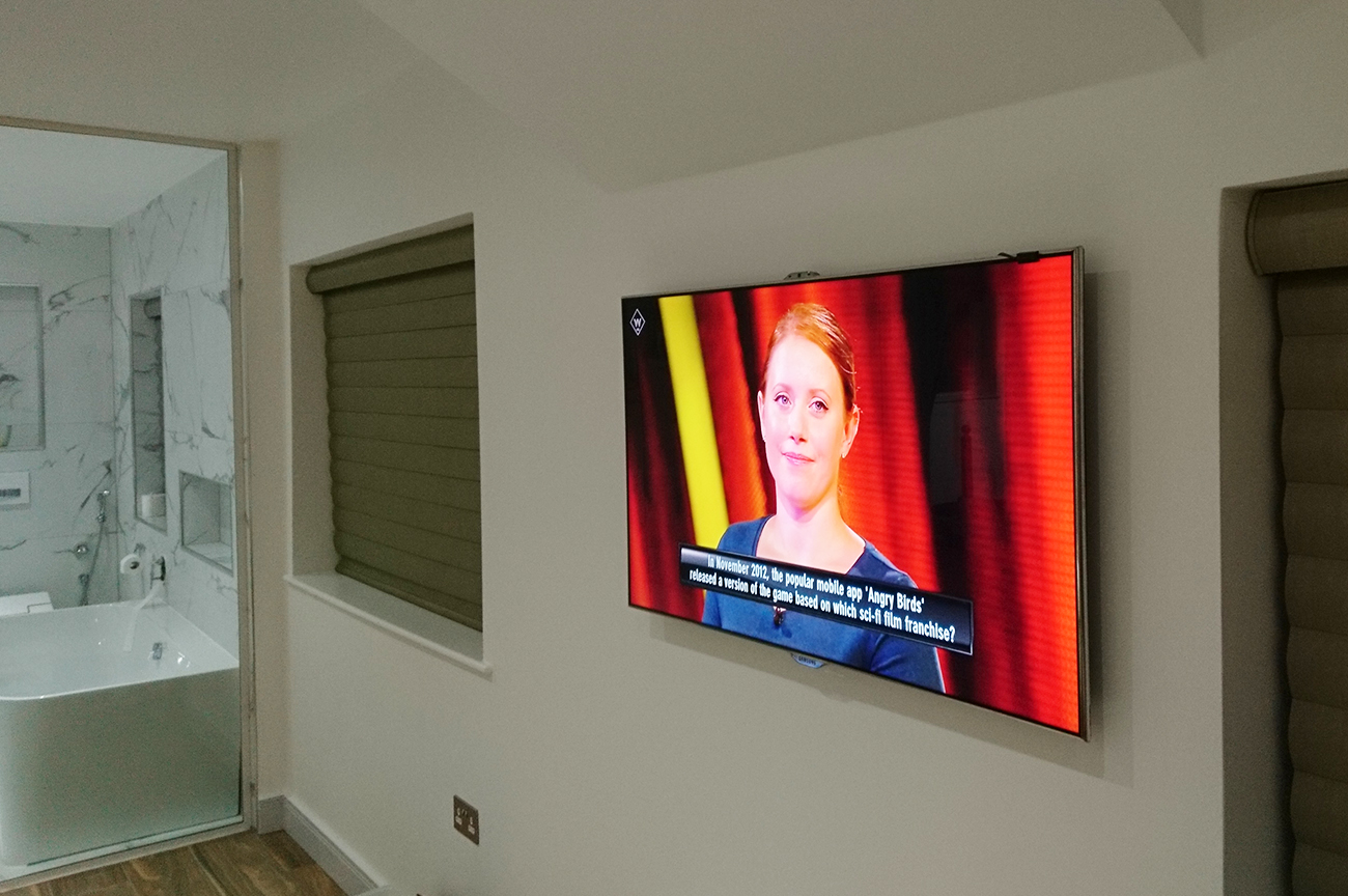 For the TV installations, the 65” Sony was positioned on a full motion Sanus Bracket in the main lounge. Kitchen had the 49” Sony on a Vivanco Tilt Bracket. The Master Bedroom had their existing Samsung 55” Smart LED with both Boys bedrooms having the existing Sony 40” Smart LED TV. Each room had an independent Sky + HD signal with full control, Freeview HD, an Apple TV and CCTV viewing. The boxes were connected via Wyrestorm 2K HD Baluns with IR Control. Reliable and robust quality and more importantly, works every time a button is pressed.